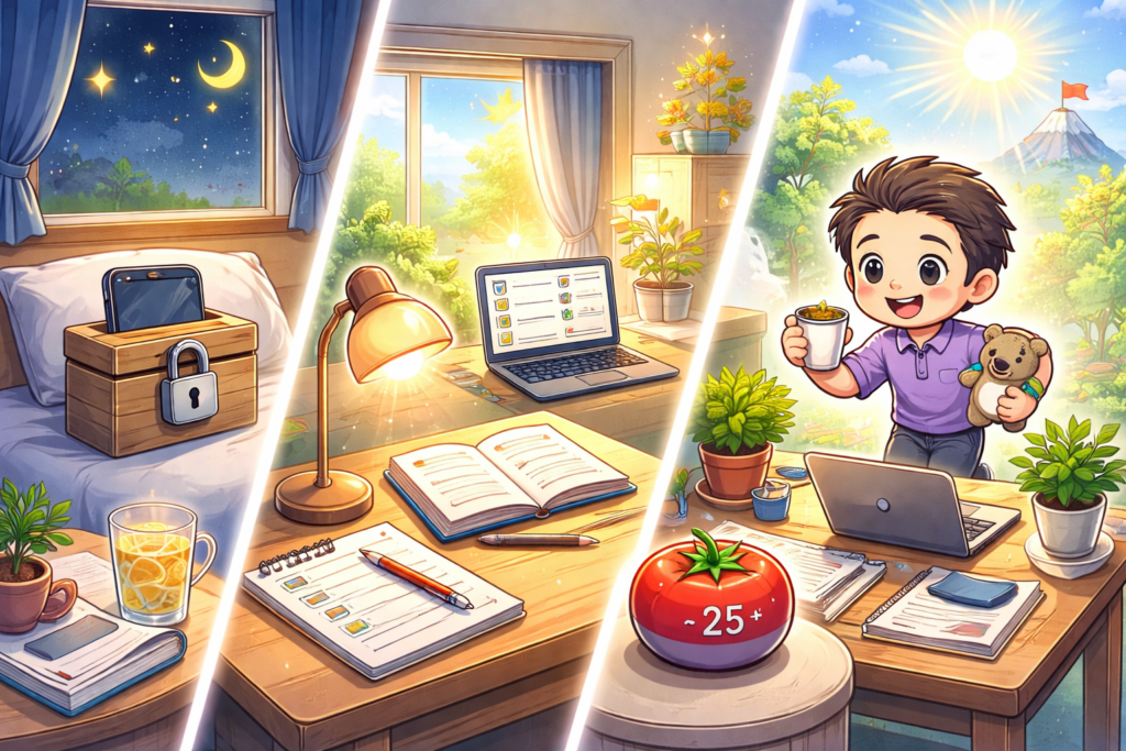- 朝の25分ポモドーロで集中力を高める
